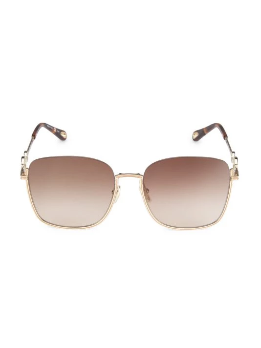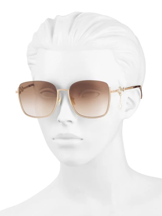 Semi-rimless metal sunglasses decorated with removable logo and faux pearl embellished charm at cutout temples, finished with tear drop shaped cutouts at tips.