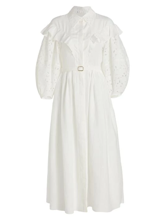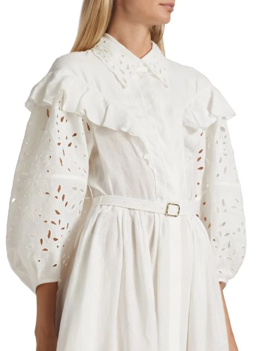 Chloé’s collection puts an emphasis on reducing the negative impact of the fashion industry with the use of botanical dyes. Gabriela Hearst pays homage to the French house’s legacy through puff sleeves, oversized silhouettes, and mixed knits infused with the designer’s equestrian and boho-inspired looks. Crafted of a luxe linen, this belted midi-dress is elevated by intricate eyelet embroidery at the collar and puff sleeves.