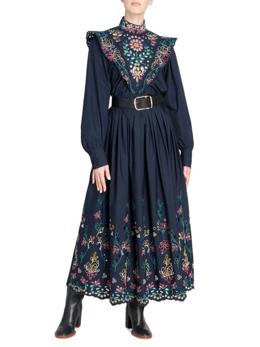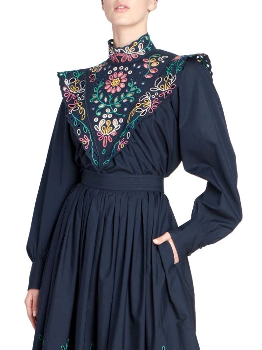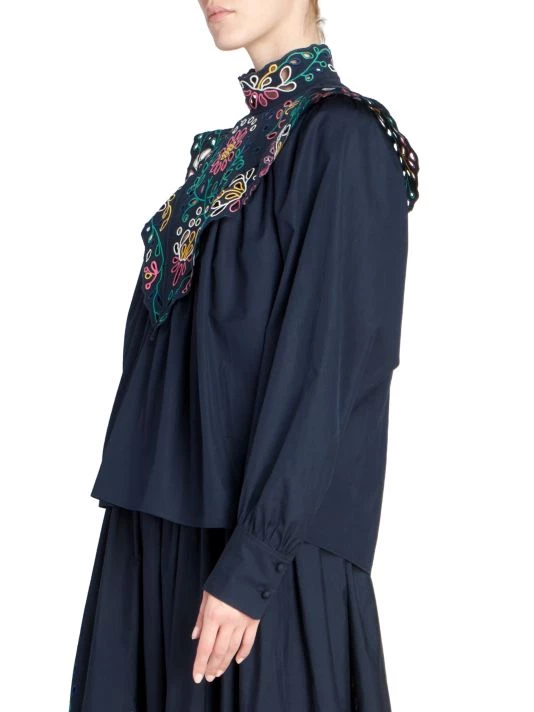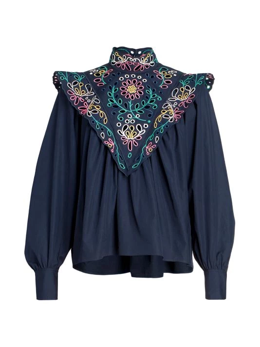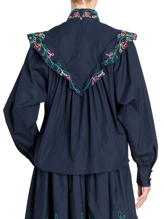 Structured blouse with bright embroidery at the bib, framed by flutter-style ruffles for added height and bishop sleeves.