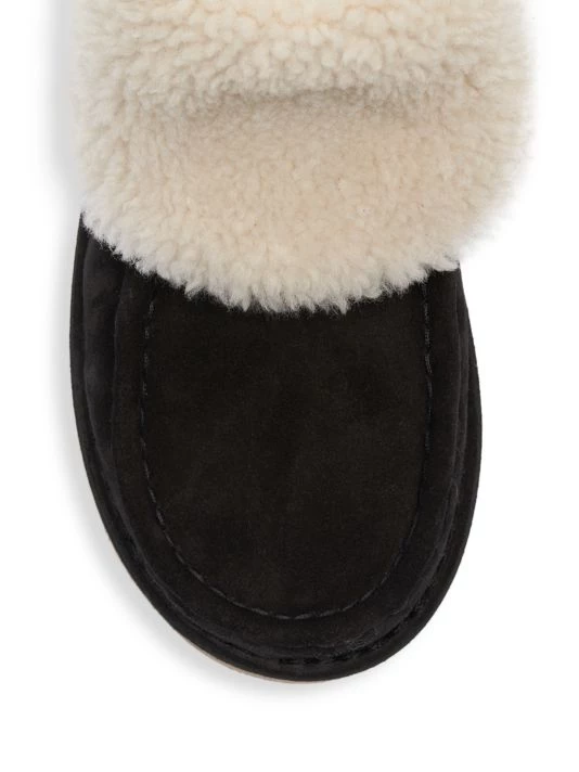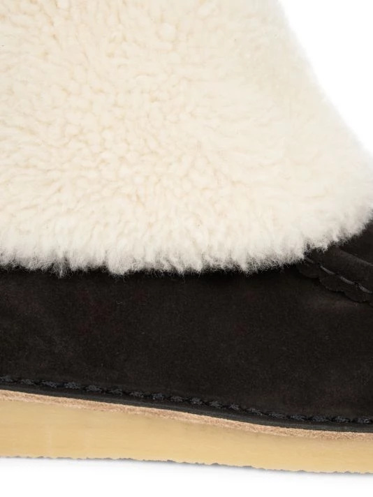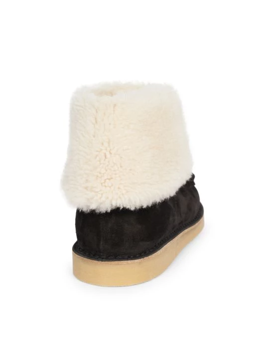 Elevated with a luscious shearling cuff, these suede ankle boots feature a chic scalloped trim.