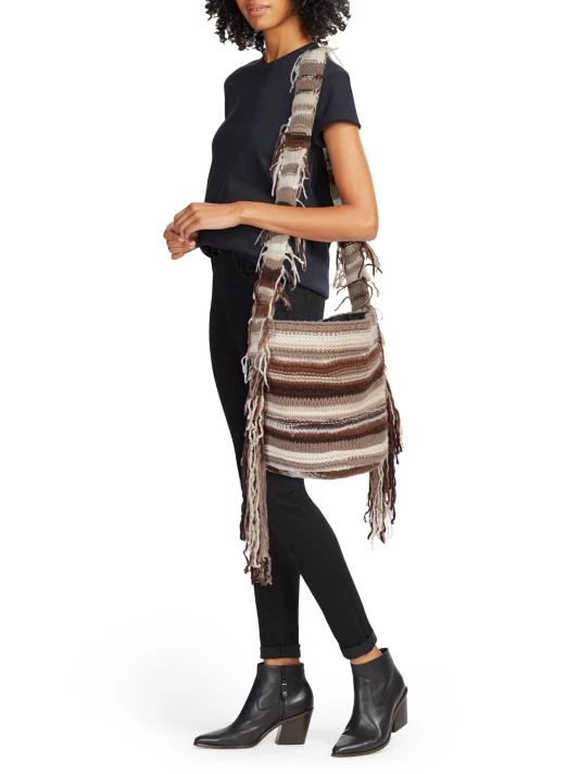 Striped cashmere creates this fine colorful hobo bag, elevated with a fringe trim evoking a bohemian allure.