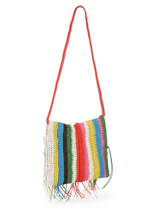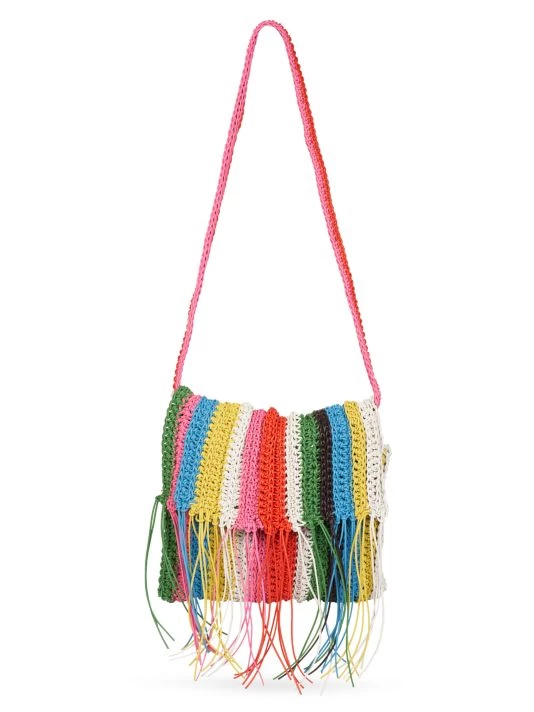 Multicolor knitted leather constructs this oversized clutch, finished with a long fringe trim for a bohemian touch.