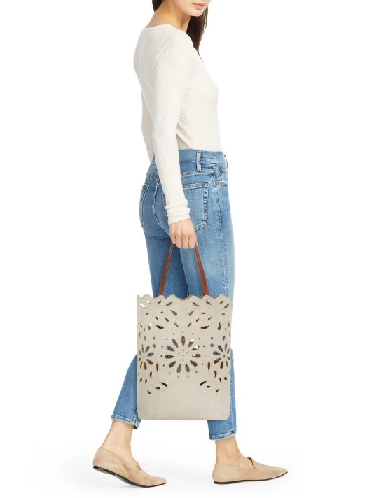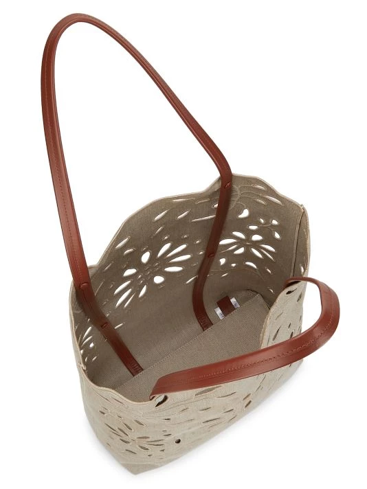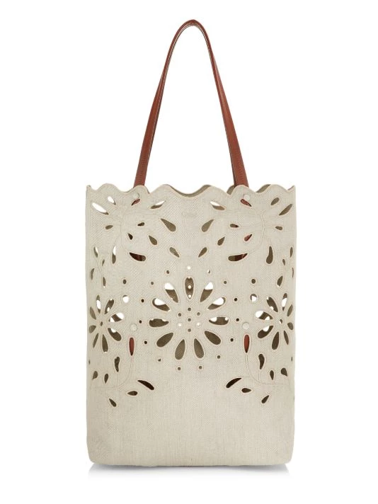 From the Kamilla Collection. Made in Italy of luxurious linen, Chloé’s tote is decorated with intricate perforated cut-outs finished with a scalloped trim. This piece is accompanied by two rich leather shoulder straps.