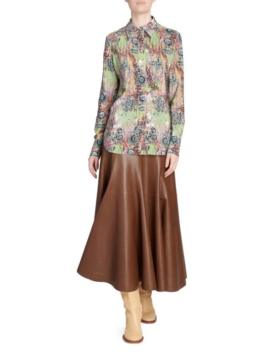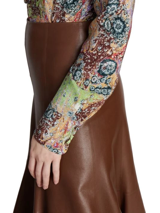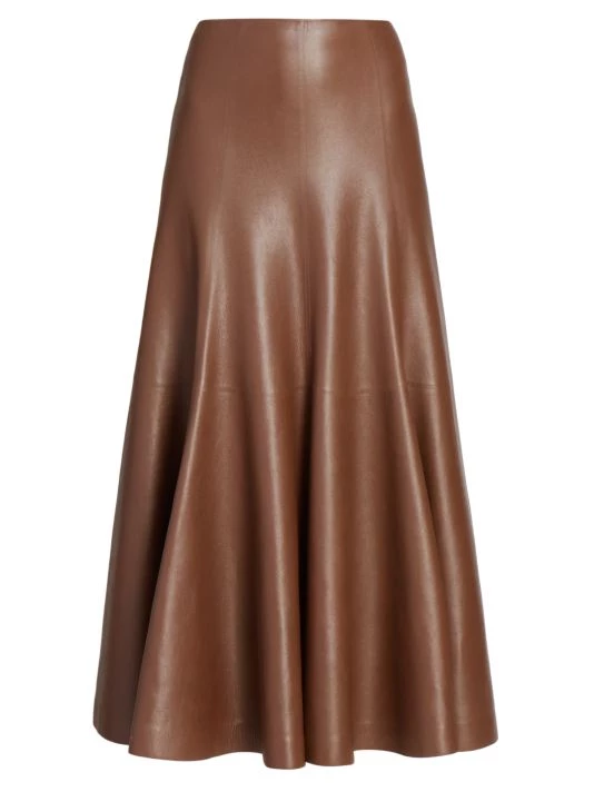 From the debut collection of the newly appointed Creative Director, this season was inspired by archival elements of the storied French house melded with bold knits influenced by Gabriela Hearst’s Uruguayan heritage. A buttery soft leather midi skirt is cut in an A-line silhouette with a full sweep for gentle movement.