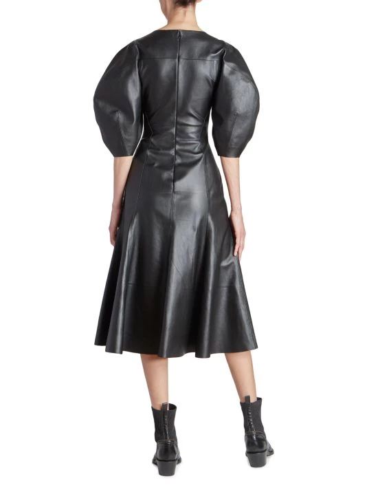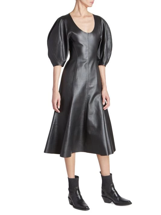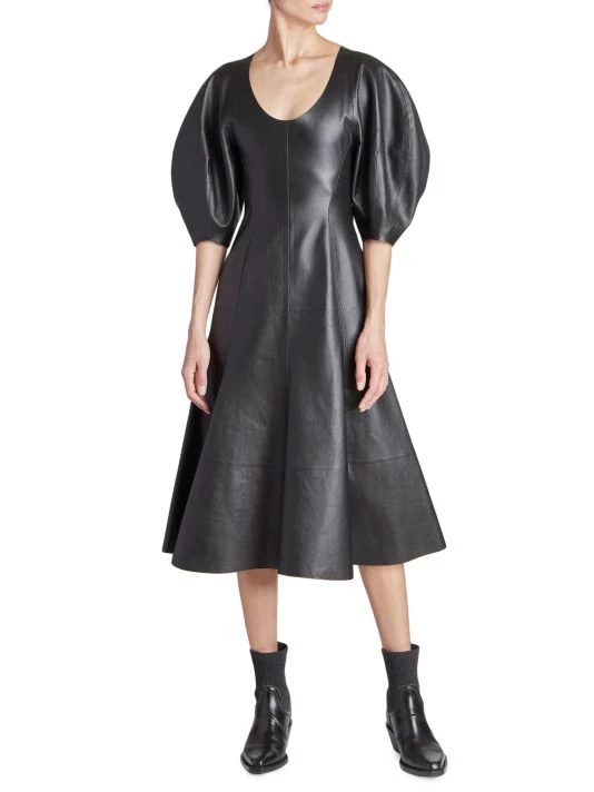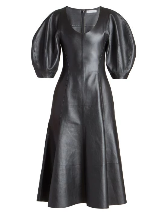 Chloé’s collection puts an emphasis on reducing the negative impact of the fashion industry with the use of botanical dyes. Gabriela Hearst pays homage to the French house’s legacy through puff sleeves, oversized silhouettes, and mixed knits infused with the designer’s equestrian and boho-inspired looks. Crafted of leather, this chic midi-dress flaunts a scoopneck, short puff sleeves, and an A-line silhouette.