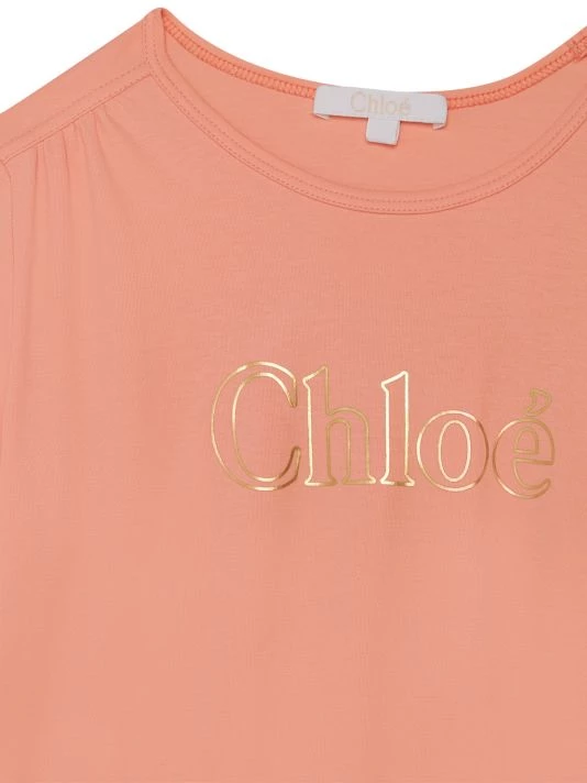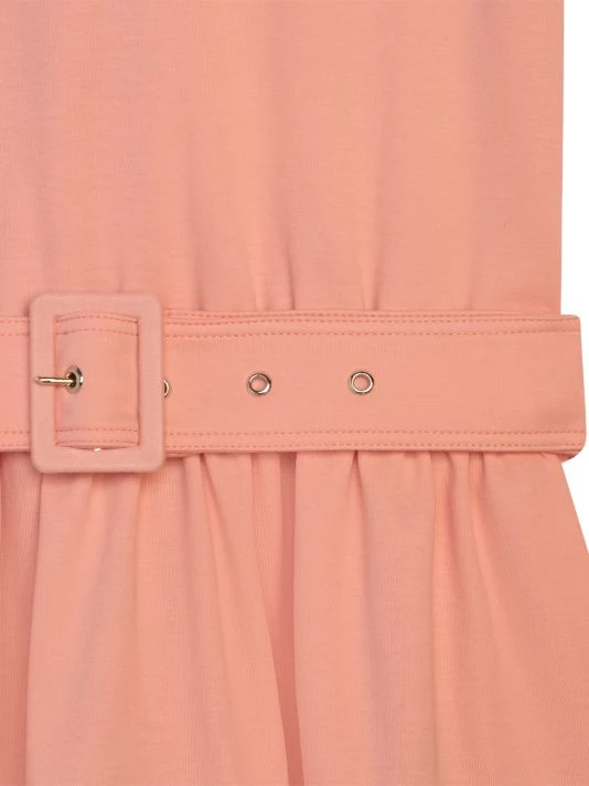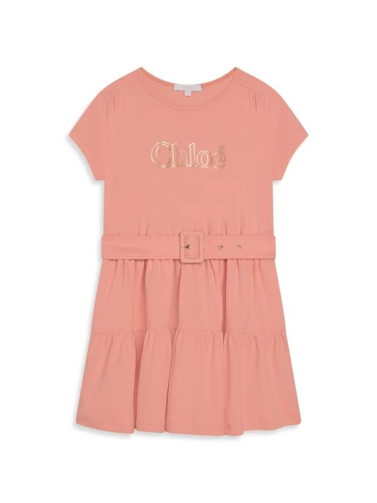 A jersey T-shirt dress features a tonal belt at the waist, a metallic foil stamp logo on the chest, and a tiered skirt.