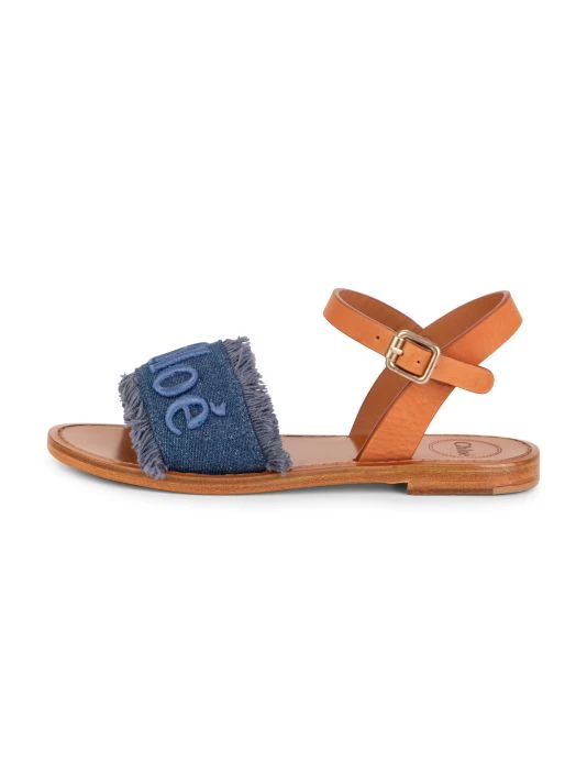 Leather and denim sandals feature raw edges and a large embroidered Chloé logo.