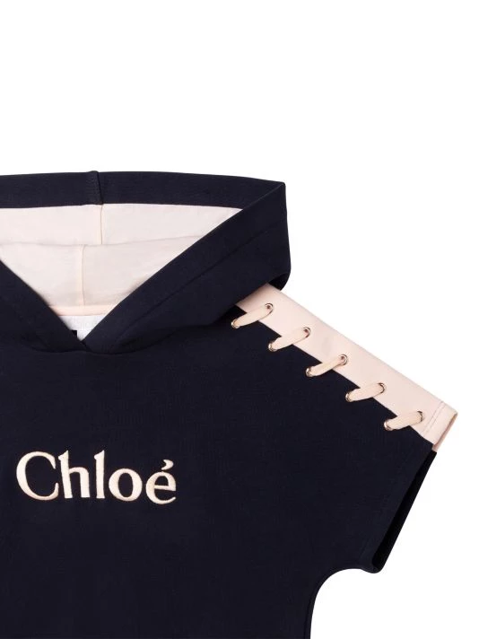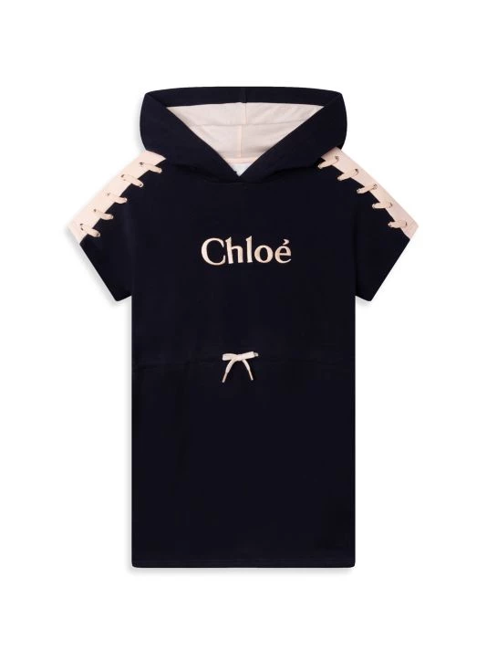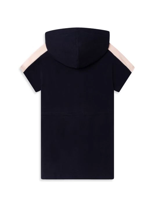 Fleece hoodie-inspired dress features a logo on the chest, knot at the waist with engraved gold trims, drawstrings, and gold eyelets.