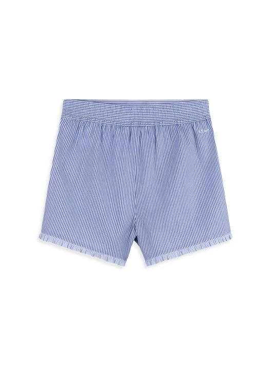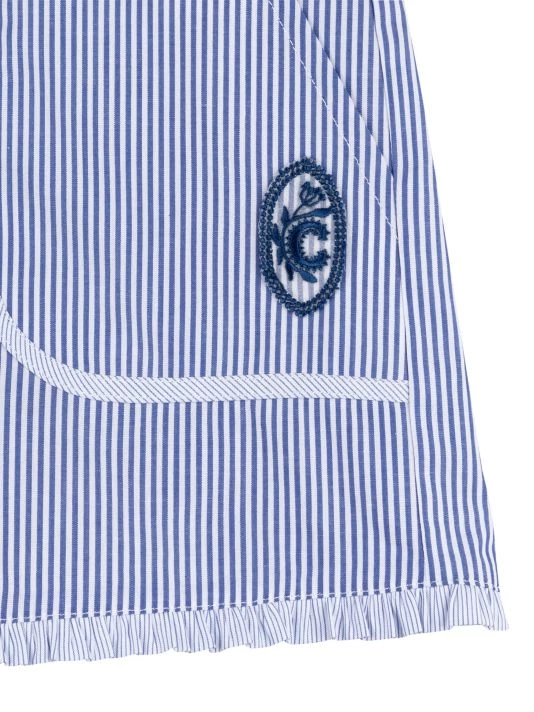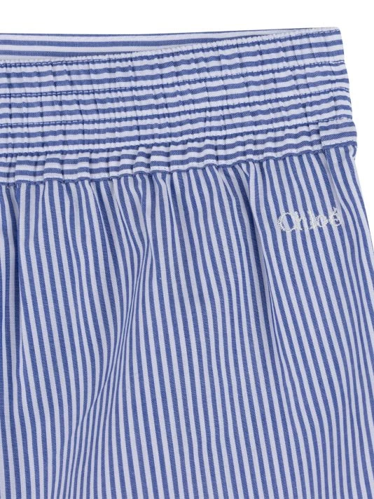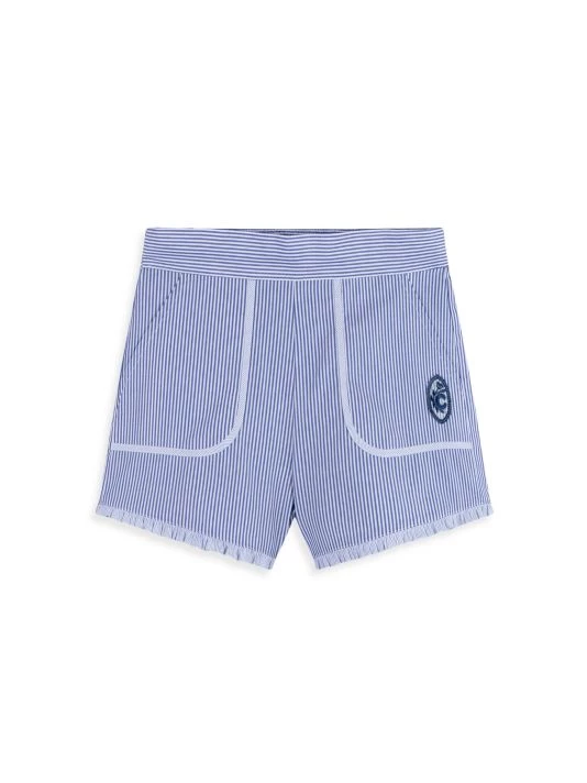 These striped shorts are adorned with signature “C” embroidery on the side and ruffle hem.