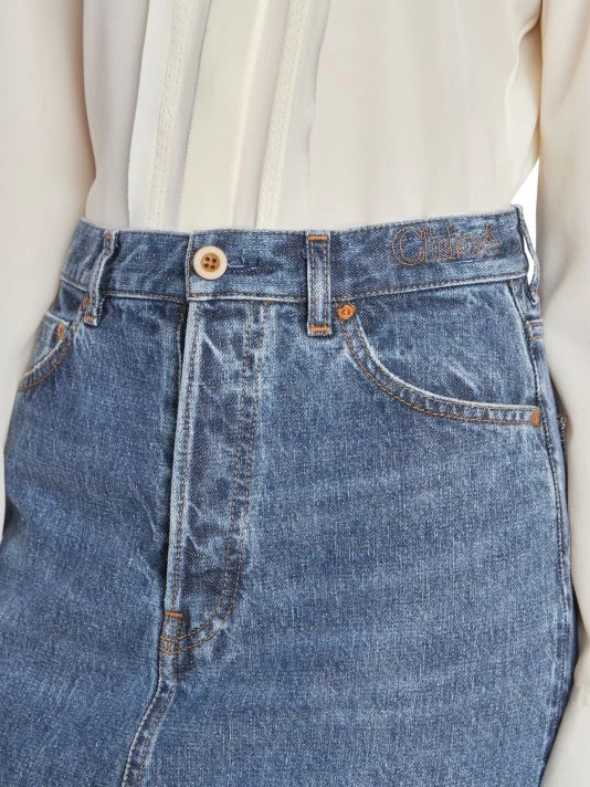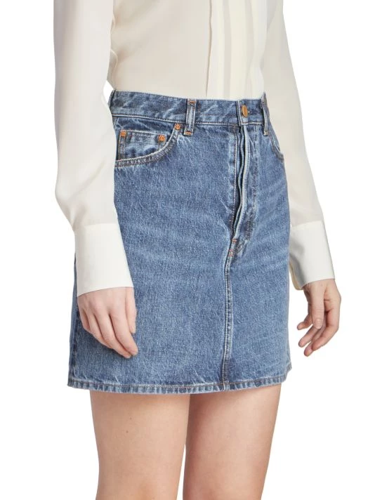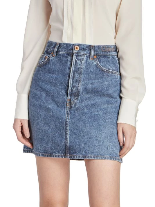 Chloé’s collection puts an emphasis on reducing the negative impact of the fashion industry with the use of botanical dyes. Gabriela Hearst pays homage to the French house’s legacy through puff sleeves, oversized silhouettes, and mixed knits infused with the designer’s equestrian and boho-inspired looks. This denim miniskirt is enhanced by contrast logo topstitching at waistband.