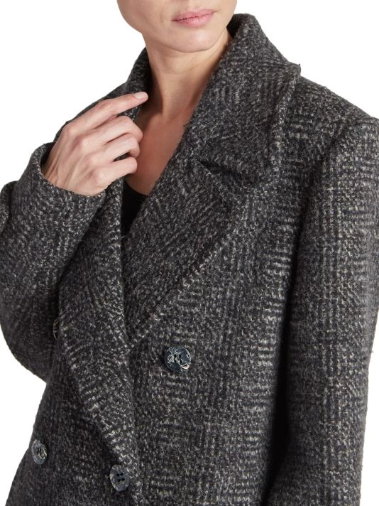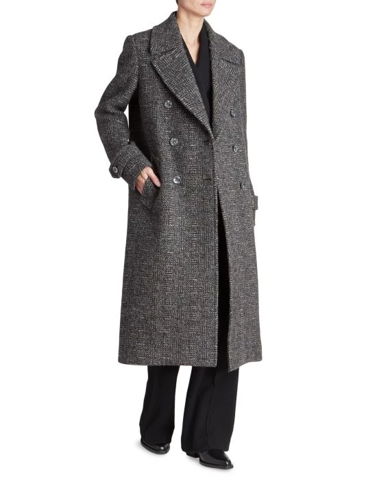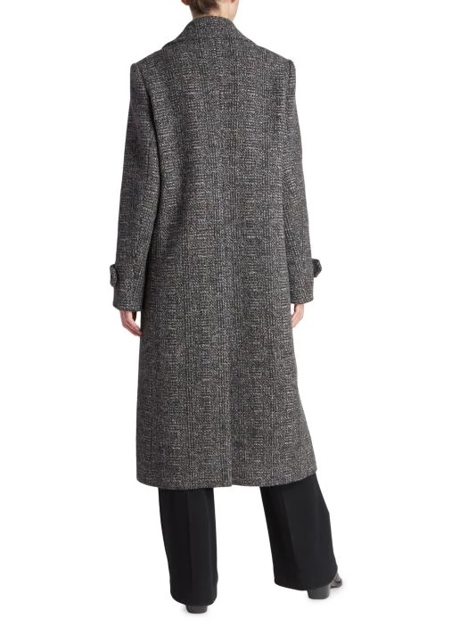 Chloé’s long wool coat is defined by a complementary double-breasted button front.