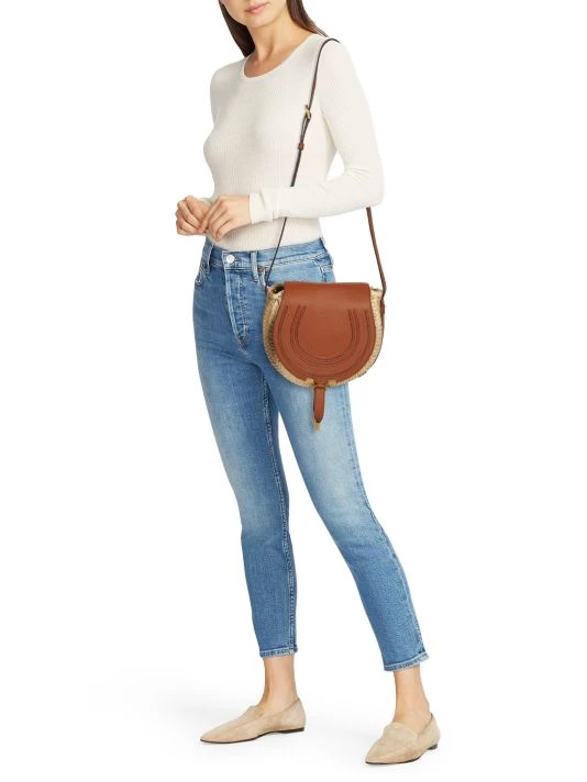 Designed in a classic saddle silhouette, the Marcie bag from Chloé is crafted of braided raffia with leather accents.