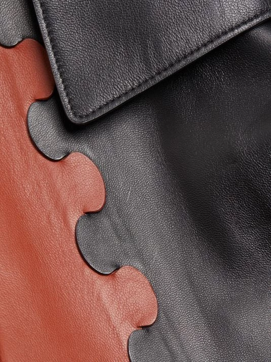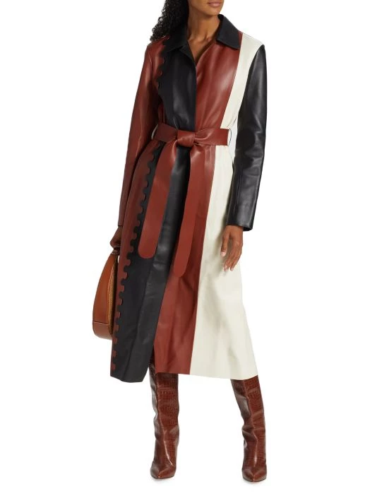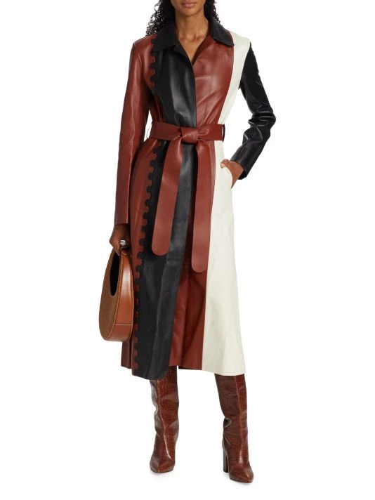 Chloé’s collection puts an emphasis on reducing the negative impact of the fashion industry with the use of botanical dyes. Gabriela Hearst pays homage to the French house’s legacy through puff sleeves, oversized silhouettes, and mixed knits infused with the designer’s equestrian and boho-inspired looks. This belted leather coat boasts paneled colorblocked styling.