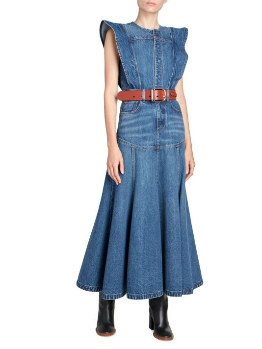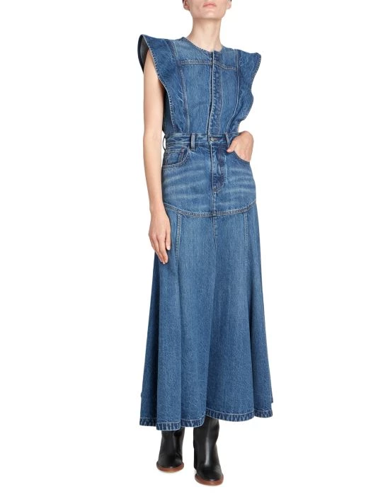 Denim maxi-dress with feminine flutter cap sleeves and a draped, pleated skirt.