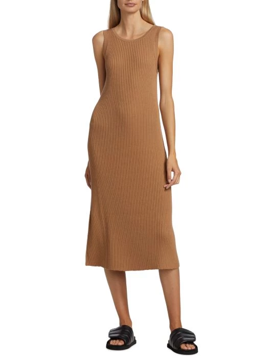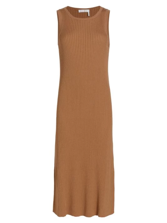 Chloé’s collection puts an emphasis on reducing the negative impact of the fashion industry with the use of botanical dyes. Gabriela Hearst pays homage to the French house’s legacy through puff sleeves, oversized silhouettes, and mixed knits infused with the designer’s equestrian and boho-inspired looks. Knit from a wool and cashmere blend, this sleeveless midi-dress is defined by textured rbbing and complementary banded trim.