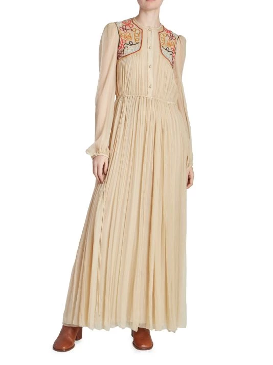 Chloé’s collection puts an emphasis on reducing the negative impact of the fashion industry with the use of botanical dyes. Gabriela Hearst pays homage to the French house’s legacy through puff sleeves, oversized silhouettes, and mixed knits infused with the designer’s equestrian and boho-inspired looks. This pleated maxi dress is complete with playful swirl embroidery at bodice and semi-sheer balloon sleeves.