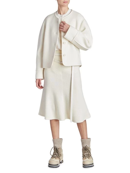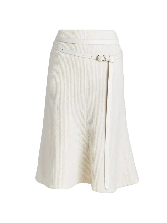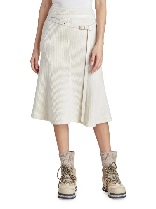 Chloé’s collection puts an emphasis on reducing the negative impact of the fashion industry with the use of botanical dyes. Gabriela Hearst pays homage to the French house’s legacy through puff sleeves, oversized silhouettes, and mixed knits infused with the designer’s equestrian and boho-inspired looks. Crafted of virgin wool, this pleated skirt is styled with a leather double-wrap belt and flared hem.